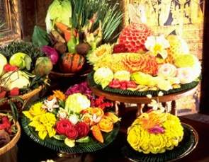 sind wahre Meister oder wohl besser Künstler im Verzieren von Obst oder Speisen.Thailands Küche ist einmalig, sie lebt von den Gewürzen und den Düften. In Deutschland macht man die Küchentür zu, damit der "Dunst" nicht durch die ganze Wohnung zieht, in Thailand "ißt" schon die Nase mit. Bei Manchem aber auch nicht, wie bei den kleinen, getrockneten Fischen, die zum Reis gegessen werden. Wer es selbst ausprobieren möchte, hier ein paar wenige Rezepte. Für uns lohnt sich das aber nur, wenn man ohne Probleme an die Zutaten kommt.