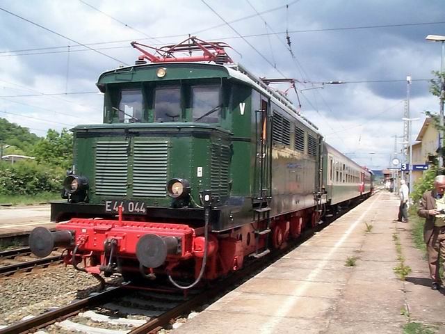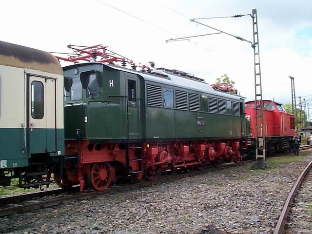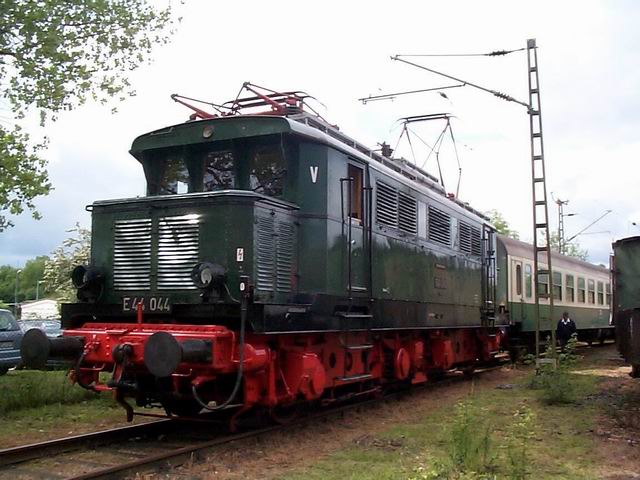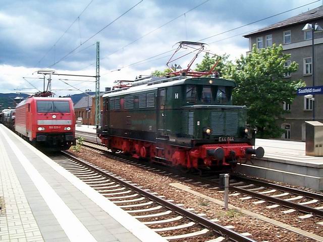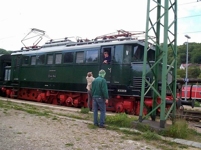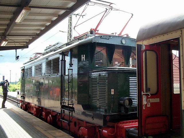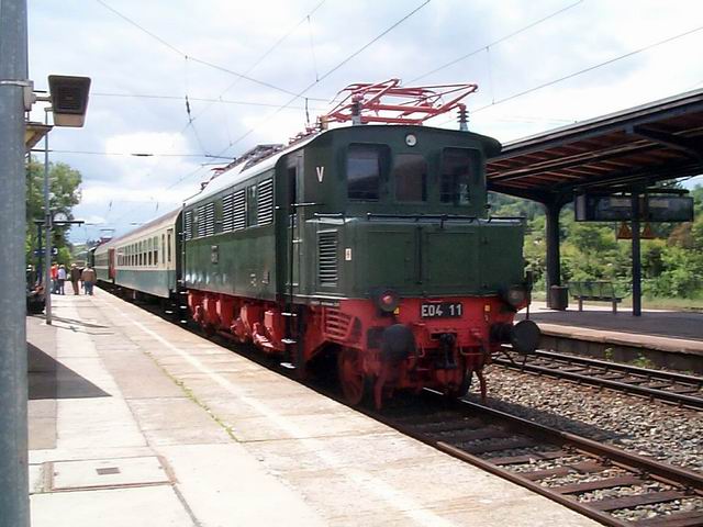 Am 22. und 23. Mai 2004 fand im Bw Weimar ein Eisenbahnfest der Thüringer Eisenbahnvereins statt. Neben der Fahrzeugausstellung war ein Höhepunkt die Sonderfahrt von Weimar nach Saalfeld über die Saaletalbahn Großheringen - Jena Saalbahnhof – Jena Paradies – Göschwitz - Rudolstadt – Saalfeld /Saale und zurück. Die Fahrt fand aus Anlass des 125 jährigen Bestehens der elektrischen Zugförderung in Deutschland satt. Zuglok war E 44 044. Im Schlepp befand sich die rollfähige Lok E 04 11 vom Thüringer Eisenbahnverein. Die elektrischen Lokomotiven der Baureihen E 04 und E 18 waren auf dieser Eisenbahnstrecke bis zum 2. Weltkrieg im Schnellzugdienst von Leipzig nach München über Weißenfels – Naumburg - Jena – Saalfeld – Nürnberg im Einsatz. Ich hoffe, dass für die nächste Sonderfahrt auf der Saaletalbahn mit unserer Lok E 44 044 zusätzlich noch eine betriebsfähige E 18 zur Verfügung stehen wird. |