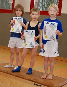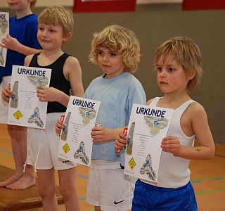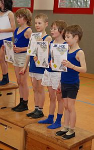 Die Bezirkssieger des Jahrgangs 2001/2002 (oben links). Auch der zweite Platz in demselben Jahrgang ging an den TSV (oben Mitte). Im Jahrgang 2000 und jünger wurde unsere Mannschaft 3. (oben rechts). Im Jahrgang 1998/1999 belegten unsere Turner den zweiten Rang (unten links). Der Sieg im Jahrgang 1995 und jünger ging souverän an unsere Turner (unten rechts).