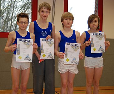 Wintermannschaftswettkämpfe 2009 Bei den Wintermannschaftswettkämpfen 2009 waren unsere Turner in der eigenen Trainingshalle Gastgeber für die Mannschaften der anderen Vereine des Bezirks. Der TSV trat gleich mit fünf Mannschaften an - und alle konnten sich für das Gaufinale qualifizieren. Ein toller Erfolg!