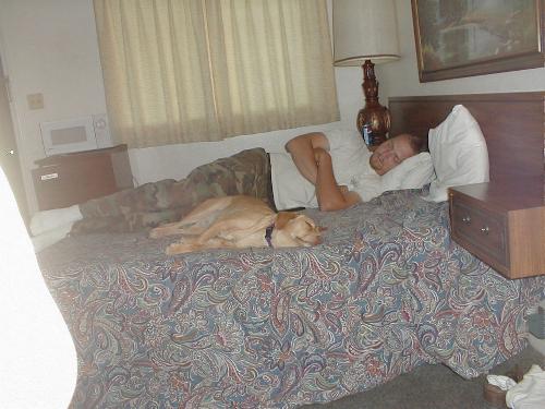 | After a long day this is a common sight. This is the wonderful motel which we stayed in. There are not a lot of good motels in Ely, and fewer that will let you keep Tara in the room. |