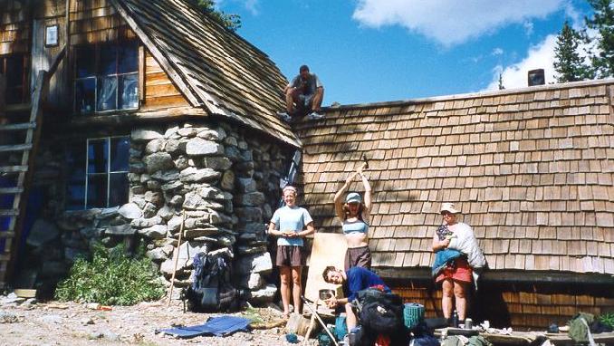 Scott(the wino), Gwen(holding Duckie), Rachel(the beheader), Ben(the beheadee) and Becky(with water gun) at the Peter Grubb Hut, CA