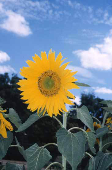 I found the colour contrast between the Sunflower and sky quite dramtic in this shot, and even had the bonus of a bee posing on the flower head into the bargain. Canon EOS 10 with a 28-200mm Tamron zoom at 100mm. |