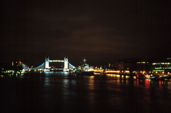 Shot from London Bridge over the Thames, HMS Belfast fronts Tower Bridge in the Port of London and the bridge glows blue in the dark. Canon EOS 10 with 28-200mm lens at 200mm. |