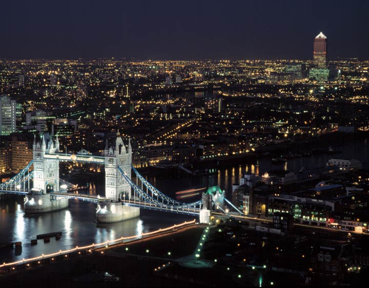 Taken on the same evening from Guy's Tower again, I waited for the sun to set to get a second image of Tower Bridge in the dark lit only by its floods. Bronica ETRSi with 180mm Bronica lens. |