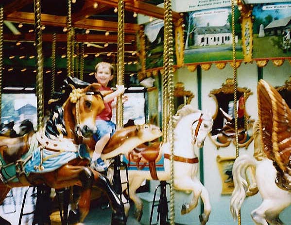 | All the animals on the carousel (not counting the horses) are native to the area of Bear Mountain. Here is Vince enjoying a ride on an otter. |