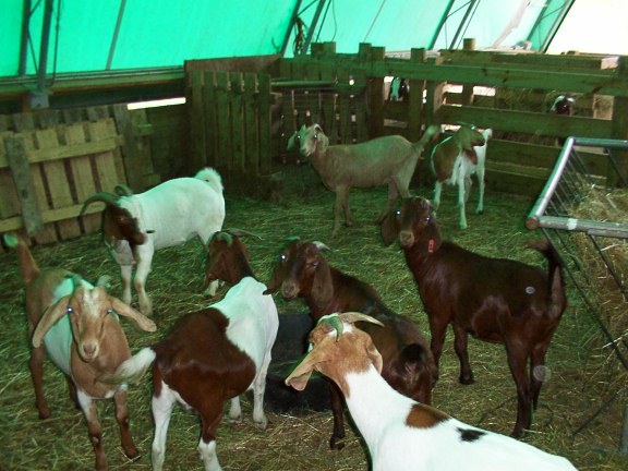 This is a group picture of our "yearling" does.  All of these does are approximately 1-1/2 years old.  This will be their first year to kid.  All should be bred (by our buck whose sire is Magnum Power Pack) and due in early December, 2005.