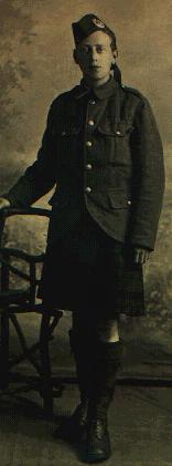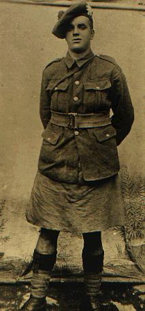 | #9 A Private in the Black Watch (Royal Highlanders). The large cap badge is that of the BW, although this regiment often did not wear a badge at all. The webbing belt and claw buckle is the 1908 pattern, but the protective khaki cover for the kilt indicates that it was taken during WW1, possibly in the second half of the war. |