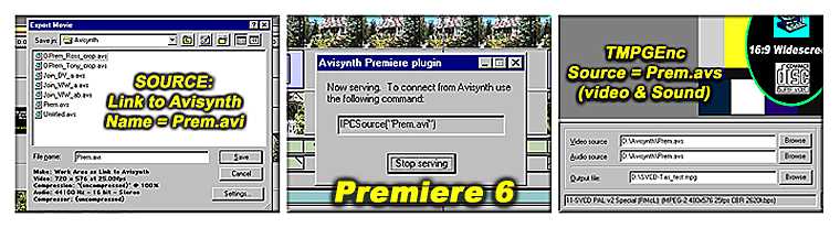 You will be well advised to produce a specific export template for the "link to avisynth" process with all the usual parameters adjusted to suit your needs. When export is chosen and after you provide an output name (eg Prem.avi) Premiere 6 will go into frame serving mode. At this point the Premiere/avisynth window will indicate what must be contained in the avs script file.