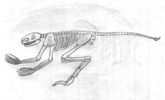 The Gnalish Elt skeleton bears some resemblance to that of the Tarn; there are clearly common roots. The overall posture is similar, although the El t tend to be more stooped and naturally stand with their spine in an almost horizontal position. The skull is adapted to this, and all sensory cavities are directed along this line of vision. However, Elt are capable of maintaining an erect posture, and when they do so their skull can pivot forwards to form a more humanoid position. The actual bones are very different. They seem almost artificial, like reinforced replicas of Tarn bone tissue. Elt bones have no air pockets, they are very heavy, and much thi c ker than Tarn bones. The ribs are fused together, forming a rigid shield over the chest. The skull is very thick, but the comparitively equal brain cavity makes the Elt skull outwardly larger. Both hands and feet end in much larger claws than the Tarn, and these are fully suited to hunting and slaying prey. The Elt tail is fully prehensile, and also ends in a bony projection that is different in each specimine. The most striking feature of the Gnalish Elt are its four arms. These extend from a unique broad clavicle and bifurcated scapula.