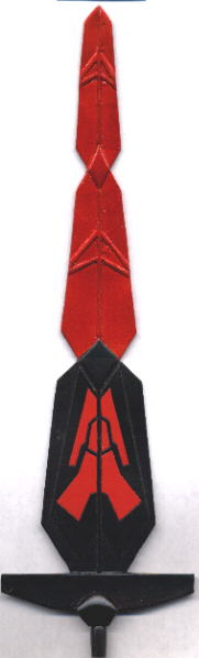The Brave Sword is pretty much identical to the God Fire Sword, minus the staff and some small details. It's actually a resin recast of my scratchbuilt GFS, and I don't recommend anyone else trying this unless you're very experienced with resin recasting (unlike me) and even then, I'm sure it'd present a big challenge. First, its just too big, and second, I can't tell you how many times the tip of it has broken off:( Anyway, the two top blade segments were painted metallic red, with the rest black and normal red.