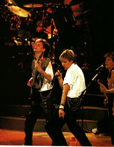 | This video was filmed during an arena concert in 1983, which was the height of their popularity. Know what that means? The crowd is filled with 10 trillion screaming teenage girls. Oh Yeah! I want to be there! Opps, no personal comments during this part. Best looking: Mixed reviews K: John and Simon B: John C: Andy T: John, although he needs to cut his hair. Artistic factor: 4 (not very original save the couple in chains on the screen above the stage.) Dress: C: I like Simon’s white shirt. K: Yeah he looks good. But check out the leather pants on John. Can we say HOT! B: But seriously, what were they thinking in the 80’s? And Andy cut your hair! T: The hair needs to stay in the 80’s. K: Nick’s sweater looks like something the cat dragged in. T: I would have to agree with that. The sweater is just gross. Comments: K: The jump at the beginning was sweet. B: Shocking! Simon’s dancing is in rhythm. K: The energy in this video is great. C: Adrenaline. I don’t like the concert videos, they’re boring. B: Andy, AHHH! K: He’s scary! So’s Nick. T: Nick and Andy need to take a vacation from this video. K: There goes Simon doing that Finger pointing thing again. They also have this theme of female dominance. I dig it. B: The girl back ups are good. T: I don’t dig the singers. And what is with the water fall? Talk about tacky! C: Very bad animation on the waterfall. Over all grade: B Christi was bored with it., Bernadette was frightened by the fashion, Torrey liked the song, and Kim loved the video. K: Hey, the song is awesome. |