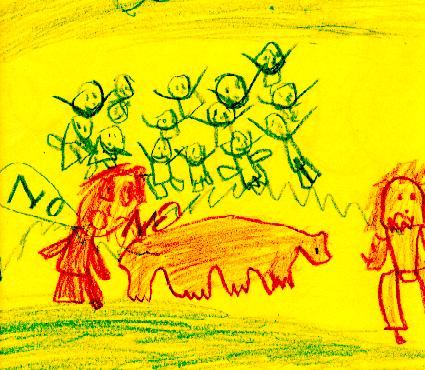 Once upon a time there was some bad men that changed innocent people into bears. One day, a little boy was walking down the street. A bad man tried to change the boy into a bear with a spell. Right then, the boy held up a mirror and changed the bad man into a bear. Then, everybody was happy. They made him a king and president and mayor. He didn’t boss people around. He freed the innocent people and put the bad men in jail. He was the hero of that day.