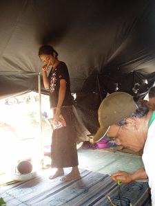 EMをテント内で噴霧しているところ。一般の殺虫剤だと、人体への影響も多少なりとあり、また、食べ物などにカバーをしなければなりませんが、EMの場合はその心配が全くないので安心です。テント住人はまだよくわかっていないので、少々不安そうに見ていました。