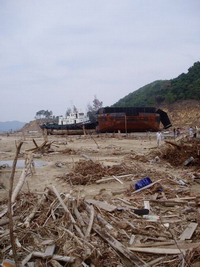 大型船舶が津波で押し流されて陸地の奥まで来ています。ここの他にも、海岸から5キロの地点に2万5千トンの船が居座っていました。私たちが訪れたとき、その船の下にあるものを引き出そうとしている家族がありました。