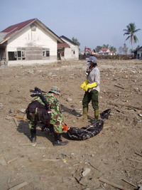 バンダアチェの町を視察しているところで、遺体が発見されたところに出会った。私たちが宿泊していたボランティアセンターにあった掲示には、前日の発見遺体は350体以上とあった。