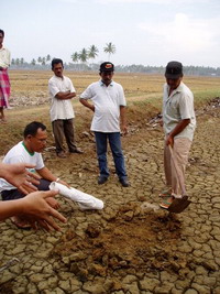 表面の粘土は灰褐色。その下のもともとの土壌は赤土です。ここに住んでいる農民はすでに数世代ここで耕作を続けてきているということですが、ここ十数年は化学肥料だけによる耕作で、農地自体も地味が落ちていることが伺えます。この周辺は灌漑設備もなく、全く降雨だけに頼っています。津波以降、ちょうど乾季で降水もほとんどなく、地表の粘土層は地割れして固まりつつあり、これが完全に固化してしてからでは、耕作に余分な力が必要となります。ここでは例年8月頃からの雨季に合わせて田植えが始まるようですが、理想的には、それに間に合わせたいというのが農民の願いです。(訂正:「例年4月から雨の量が増えるのに合わせて田植えが始まるようです」と記載していましたが、雨季が始まる8月頃が正しいそうです)