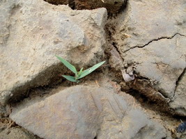 雑草も生えない高塩分粘土質土壌で、乾燥のために生じた割れ目をぬって下の土壌から芽を出した芝がわずかに見られる程度です。