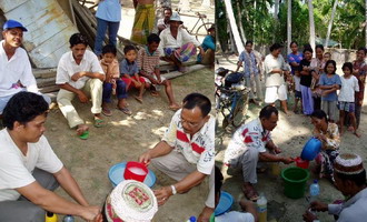 EM米のとぎ汁発酵液を作る実演中。男性と女性が全く別れて作業を見つめています。