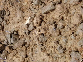 耕した田圃の土。茶色っぽいのはここ本来の土。間に見え隠れしている灰色の土が、津波でもたらされた粘土。 The cultivated soil. The brown part is the original, and the gray part brought by the tsunami waves can be seen in between.