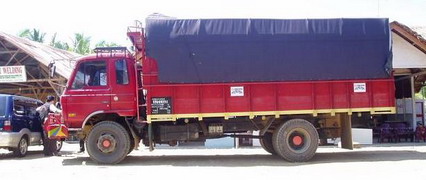 トラックの窓中央および荷台に数箇所、「アチェ支援団体 ”プロイェック・マリ・ブルブバン(重荷を共有する支援プロジェクト)”のロゴをプリントアウトした紙、前面には「アチェ津波被災土壌改良支援」とでかでかと書いてある布を貼り付けています。貨物運搬車は途中で警察や軍のチェックを受けることが多く、搬送が遅滞することもしばしばあるので、それを避けるために支援物資であることを明確にしておく必要があるのです。このほかに、運搬物資の内容を記した書類も作成して、運転手に持っておいてもらいます。