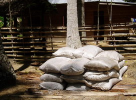 The BOKASI that had already been sent by the truck. 190 sacks had been brought in and divided to 2 places. Fowl droppings mixed with activated EM were still in ferment when they reached there, the high temperature causing some trouble when unloading. The smell is very strong also. First the sacks had been in the garden, but immediately moved to a vacant lot near the field. This is part of the load.