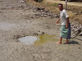 実験田の隣、何も処置をしていない場所です。雨水がたまっていますが、「非常に塩辛い」と、ユスフ村長が実際にすくって舐めてみせてくれました。