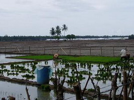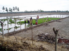種を撒いて20日目になった苗を、田植え用にまとめている作業。作業風景が、周辺の被害耕作地の中で、生き生きと輝いて見えました。