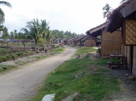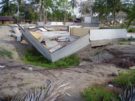 ムアラ・バトゥの海沿いの村。仮設住宅にではなく、自分たちで建てたバラックに住み着いています。倒壊して土台だけ残っている建物は、いまだにそのままの姿で放置されていました。