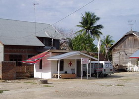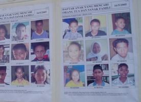 1月に被災者キャンプ地援助で訪問したムアラ・バトゥ。道沿いの土地はすっかり整備されていましたが、いまだにテント生活をしている人たち20世帯がありました。バンダ・アチェで孤児となった子供たちのために、親戚探し写真が掲示されていました。