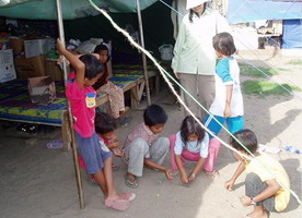 Muara Batu. Last time we were there in January. The area along the road was already cleaned up, but still 20 households living in tents. There were pictures to help the children search their relatives.