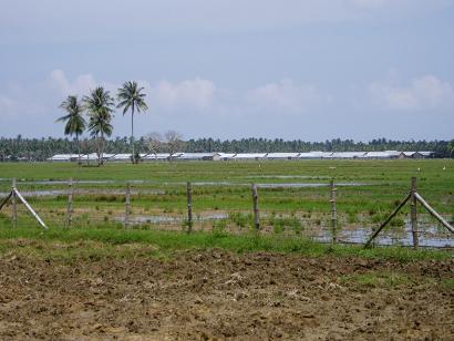 長い雨季が終わって、一面雑草が生えている被害地。芝類がほとんどです。(遠くに見えるのは仮設住宅。大部分の人は、新しく家が建ち、退居しているということでした。)