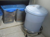 6.さて、処理用ケースがいっぱいになったら、長期保存スペースに移動。新たに空のケースを処理用として、台所に用意します。 (保存スペースとして、うちは屋上を使っていますが、ベランダとか庭とか、外がいいと思います。しばらくケースの中で発酵させておく段階で、臭いがきつくなるときがあるからです。)