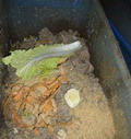 3.いよいよ、生ごみを入れます。お皿やボールなどに、生ごみをまとめておいて、それにボカシをまぶせます。魚の骨でもなんでもOKですが、さすがに鶏の腿の骨などはしばらくそのままの形が残りますね。