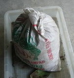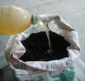 8.米袋に入れた発酵中の生ごみに、米のとぎ汁発酵液を追加(200CCくらい)。袋の口を閉めたら、ビニール袋をかぶせます。湿度を保って、発酵が進むようにするためです。この状態で2ヶ月くらい放置。それで、生ごみはまったく「土」になっています。