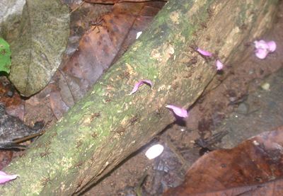 In places, the forest floor appeared to be alive, a moving carpet of green. This hallucination was brought about by the streams of leaf-cutting ants hurrying back to their nests with their booty, a triangular piece of thumbnail-sized green leaf, slung over their shoulders. From the tree of their choice ( which they were busily dissecting ) to the nest may be several hundred yards, and so these columns of green wend their way over the dark forest floor, over logs and under bushes in a steady stream that on close inspection looks like a Lilliputian regatta, all the boats having green sails.