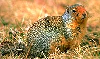 Presently, however, we came to a small clearing and there, squatting at the mouth of its burrow was the musician responsible for the ringing, flute-like cry - a fat ground squirrel, wearing a tasteful suit of rust-red and grey fur. He sat as upright as a guardsman at the entrance to his home and his ribcage pumped in and out as he gave his musical warning cry. His big, liquid eyes stared at us with that intense, slightly inane expression that most squirrels wear, and his little paws trembled with his vocal efforts.
