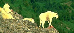 On this green surface were some white specks, which I at first thought were patches of snow, and then I saw one move and realized it was a small group of an animal I had long wanted to meet - the Rocky Mountain goat. Don't be misled by the name. The Rocky Mountain goat is the king of goats, with his soft white coat, softer even than cashmere, and his black hoofs, horns, muzzles and eyes, he is a dandy of a beast.