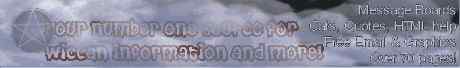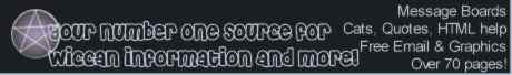 | Please put a link to Dusk Ward on your site! Please do not link directly from this site, the link will appear broken if you do because GeoCities does not allow it(it causes the servers to slow down greatly, both for your site and this one). To link to us, please pick out a banner, right click on it and select "copy". After that, upload it to your website. If you aren't sure how to link a banner, please use the following code: <A HREF="http://duskward.cjb.net"><IMG SRC="please type the location of the banner here" ALT="Dusk Ward is mainly dedicated to providing Wiccan info and more, but also contains 40 cat pages, free graphics and email, message boards, HTMl help and more!"></a> Thank you! |