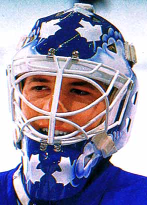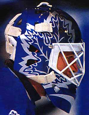 | The next design is more interesting. Two maple leafs blaze up the sides of Rhodes' head. On the chin (not visible) is a small blue maple leaf. This design was to become the basis of his latter mask at Ottawa. All objects are boldly outlined with white on a blue field. Damian looks like he's more ready to back up Potvin in this mask than the previous. |