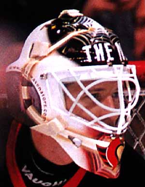 This mask is probably my favourite because it is more of a personal piece of art for Damian. You will notice that the maple leaves on the side of his helmet almost mirror those of his mask at Toronto save the fact they are red instead of blue. The Peace Tower of Canada's parliament buildings is painted on the forehead. The crest on the chin bears the initials of Damian's father. On the back piece, the nickname "Dusty" is painted on. I still have to find a good picture of Damian's Thrashers mask. But if you look at some of the pictures of him with Atlanta, you'll see that there's a big old bird's head on the top of the helmet. I've seen this done with eagles, bluejays etc. Thus concludes my critique of Dusty's masks. Hope you enjoyed. Goodnight! |