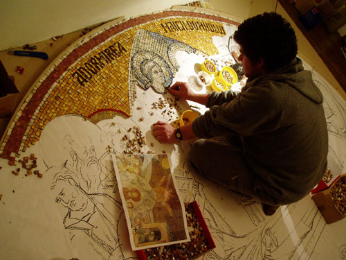 pe folii de transfer special pregatite. Transportat ca un puzzle in patru-sase cofraje, mozaicul ajunge din sufrageria-atelier pe peretele bisericii din Alba. Sper sa postez o fotografie