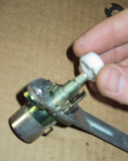 Install the white spacer and the metal washer onto the short lock cylinder.