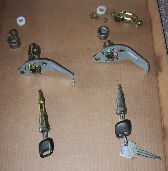 Place both lock cylinders, both keys, needle-nose plyers, and flathead