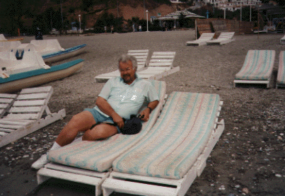 Ed on the beach of Costa del Sol Waiting for the "paella" below which is cooking near by.