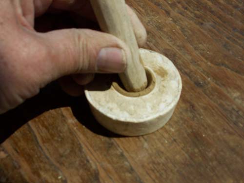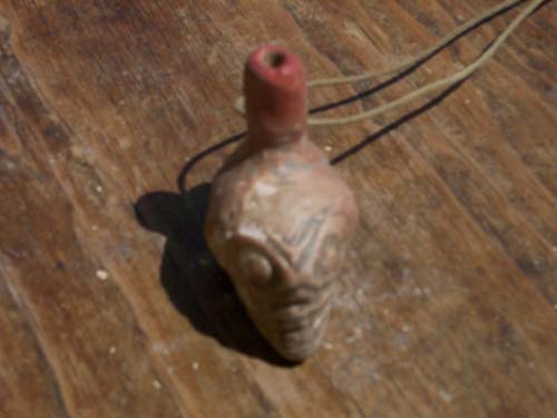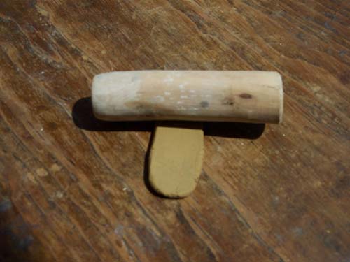 Foto 22. El frente del silbato terminado se pinta de blanco y de rojo en la embocadura, se deja secar dos o tres días. Luego se pone al sol varias horas, para que elimine la humedad interna lo más posible;