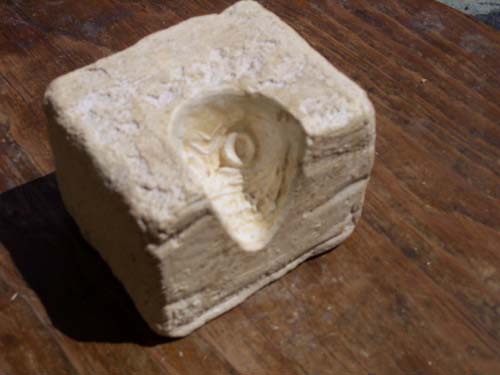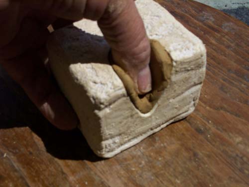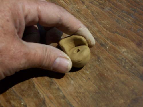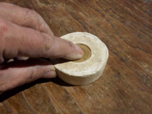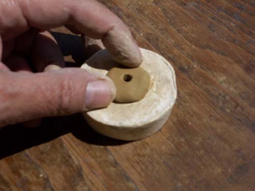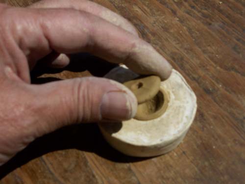 Foto 7. En el interior de un molde con una cavidad semiesférica, se oprime una pieza de barro, para formar la cámara de Helmholtz, que actua como un resorte de aire;