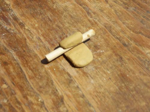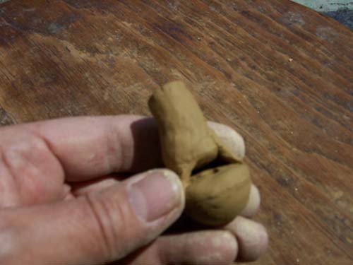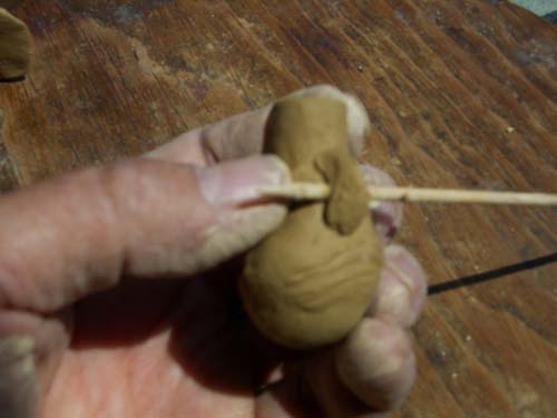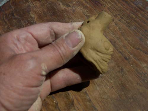 Foto 19. Ya que se endureció un poco el mecanismo sonoro, se pega otra pieza de barro por letras y se perfora con un palitao picudo para tener un hoyo de cuerda de suspensión;