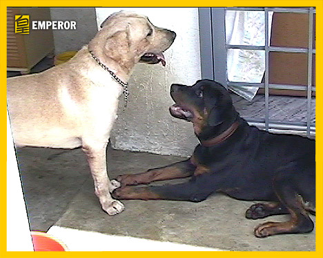 A new friend bows to Emperor. Tiger the 6-month-old Rottie is our new dog and also Emperor's best pal.