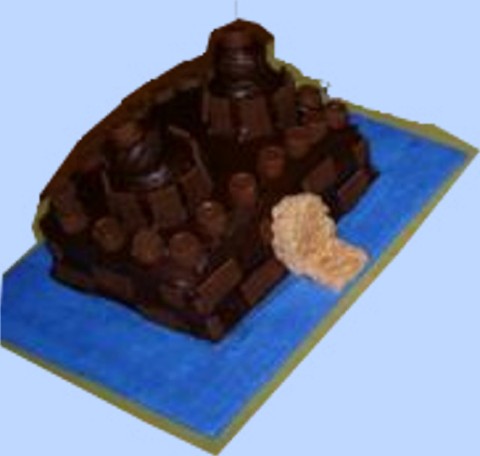 I made Triple Chocolate Cake (from a box). I put the mixture in a 9 x 13 pan. I removed enough to bake 2 regular sized cupcakes & 2 mini-cupcakes. I baked the cake about 30 minutes, the reg. cupcakes I'm not positive but I think about 17 minutes, the mini-cupcakes about 9 minutes or so. Of course, let everything cool. Cut the 9 x 13 cake in half (short way) to make 2 squares. I prefer to freeze my cakes before I ice them so the crumblies don't get all in the icing. Also, if the cake is very rounded on the top, it is best to cut the top off to make it flat (does that make sense?). It is much better to cut the top off when it is frozen & then ice it. Turn one of the squares upside down onto the other square (icing in between). Ice the whole cake with chocolate icing. Place the regular cupcakes on top with a toothpick in the top & then place the mini-cupcakes on top of those toothpicks to help them not move. After they are placed, ice the cupcake towers. Place the rice crispy door & draw-bridge on the front. Decorate the cake with Hershey rectangles sideways (writing on the inside) randomly around the cake to look like old world brick pattern. Stand the rectangles up around the bottom of the regular cupcakes. Put rolo candies on top of the mini-cupcake & around the top perimeter of the whole cake. I think that is about it. I put blue painters tape around the cake to look like the water, but I don't think people caught that. So if you want it to really look like water, you may want to draw a couple of wavy lines on the tape.